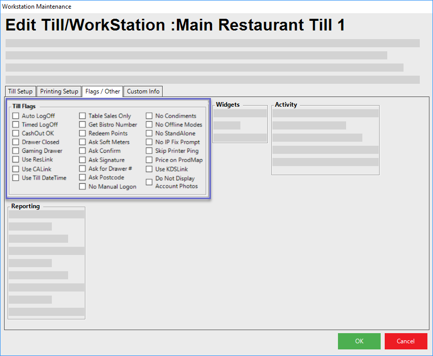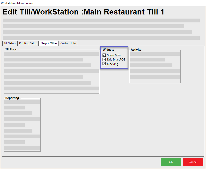 This article covers an overview of the "Flags/Other" Tab for Workstation Maintenance which provides dozens of flags that control everything from Workstation Reporting to how the SmartPOS Workstation behaves when it comes to various aspects of the operation. The Till Flags section contains flags which are more or less general settings regarding the operation of the Workstation. The Widgets section provides functionality relating to the Widgets Bar on the SmartPOS Workstation's login screen.