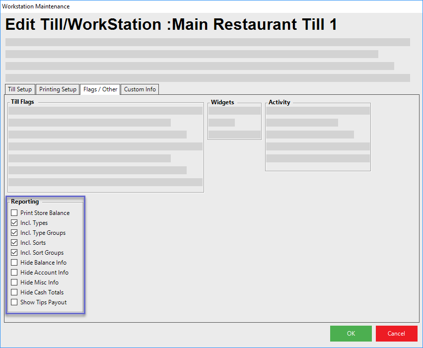 - The Reporting flags control whether or not the corresponding information will appear on the Till Balance Report for this SmartPOS Workstation