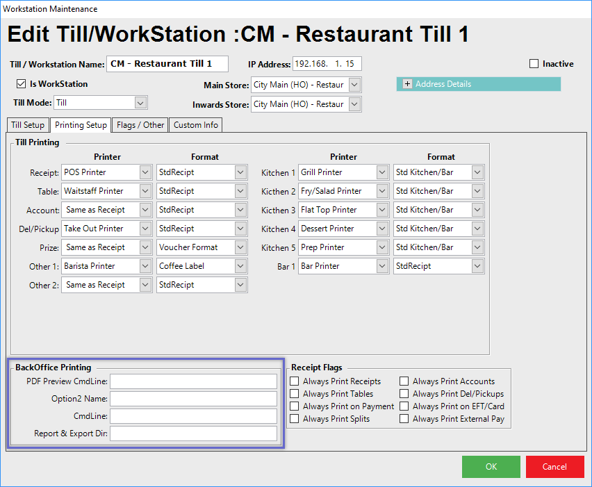 - The BackOffice Printing section is used to configure Command Lines for use when Printing PDF Files and the directory for Reports.