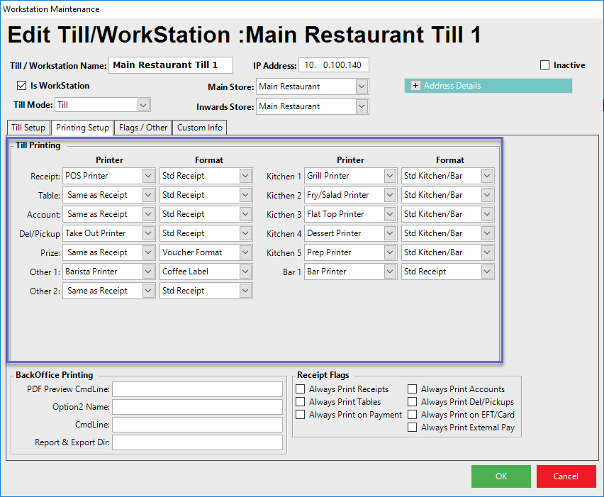 - The Till Printing section is used to configure what Printer will be used and with which Format depending on what is being printed - e.g., when Printing a Receipt, set which Printer to Print to and the Format that will be Printed or when Printing Products to a Remote Printer, set which Remote Printer and the Format.