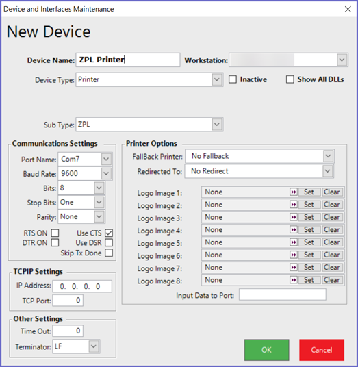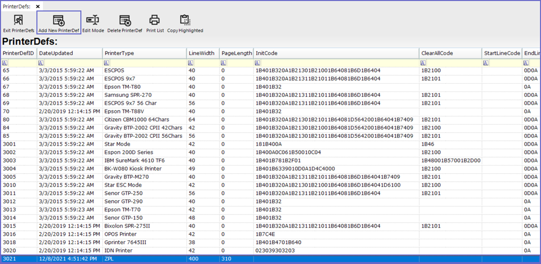 - Click on the 'Add New PrinterDef' button and enter the name of the new printer type as 'ZPL'