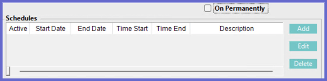 - Delete: First choose an existing schedule in the schedules list. When the Delete button is clicked the selected schedule will be removed
