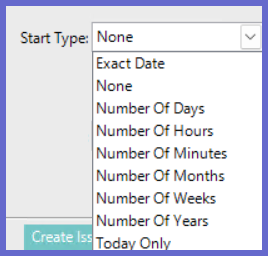 - This field will have a dropdown list to select a starting date/time. Leaving it as 'None' will have the current date and time as the start value. When another option is clicked a field will appear underneath, where users can specify a value.