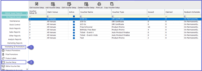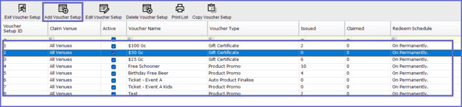 - To add, press "Add Voucher Setup" in the header or double-click a row in the list to edit an existing voucher
