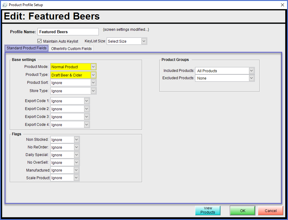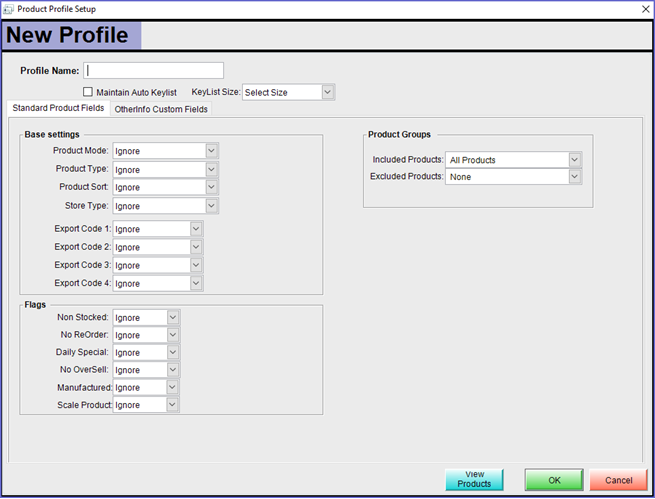 • The Fields and Flags within the Product Profile Setup window will set the configuration for the Product Profile; these will be explained in detail below