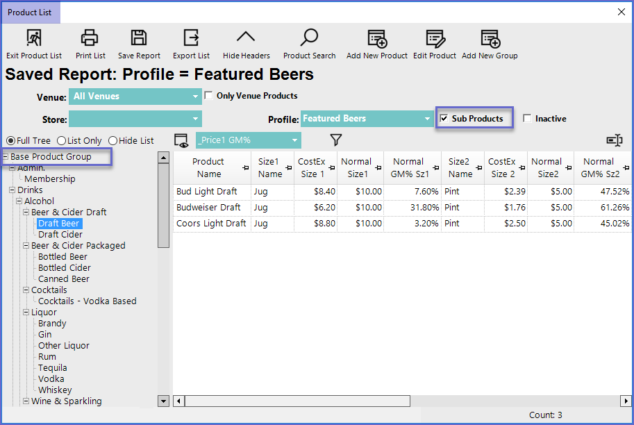 • To make sure that all the available products are visible, select Base Product Group and enable the Sub Products Flag
