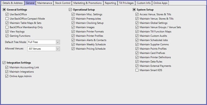 This tab contains some basic, general settings which control if and how an Operator can use BackOffice.