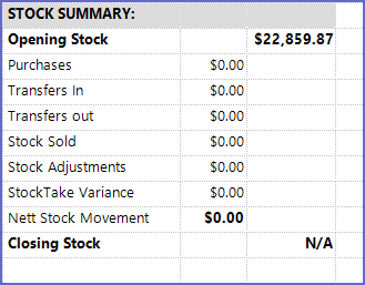 The Stock Summary section of the Period Summary Report consists of the following fields: