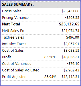 The Sales Summary section displays the sales history of the business including the Cost Variances and Adjusted Sales