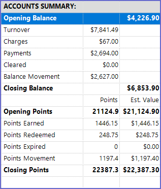 The Account Summary section displays the total turnover and payments made from Account transactions along with the details about the Points system